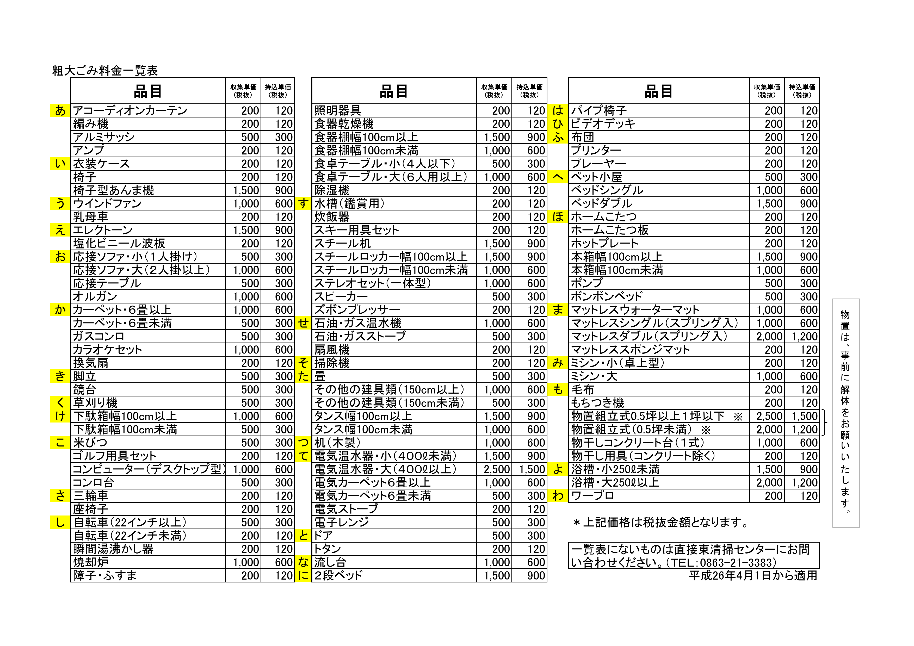 粗大ごみ料金一覧表 [PDFファイル/59KB]