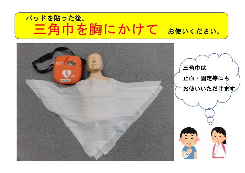 玉野市では、公共施設等に設置しているAEDケースのカバー内に三角巾を配備し、それを女性の体にかけることでプライバシーを守り、躊躇せずにAEDが使用できるような取組を実施しています。